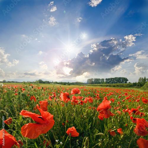 Mohnblumenfeld im Sonnenuntergang Gegenlicht