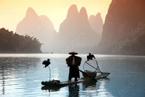 YANGSHUO - JUNE 18: Chinese man fishing with cormorants birds in