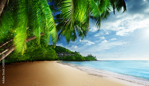 sunset on beach Anse Takamaka of Mahe island, seychelles