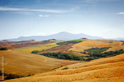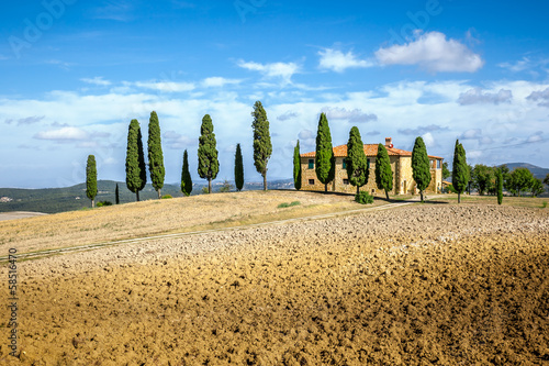 Tuscany, farmland, cypress trees and road. Siena, Italy.