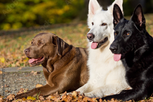Brauner Labrador mit zwei Schäfern