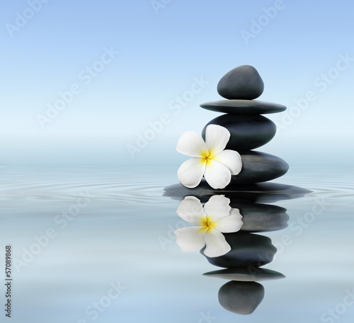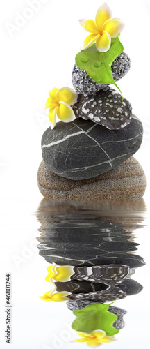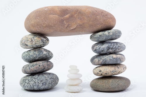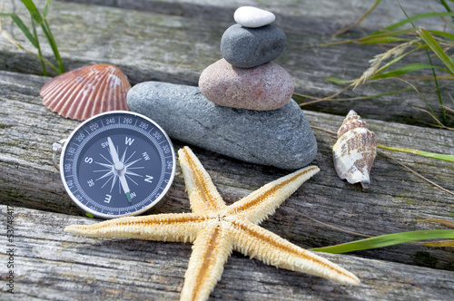 Steinpyramide mit Kompass, Muschel und Seestern auf Holz